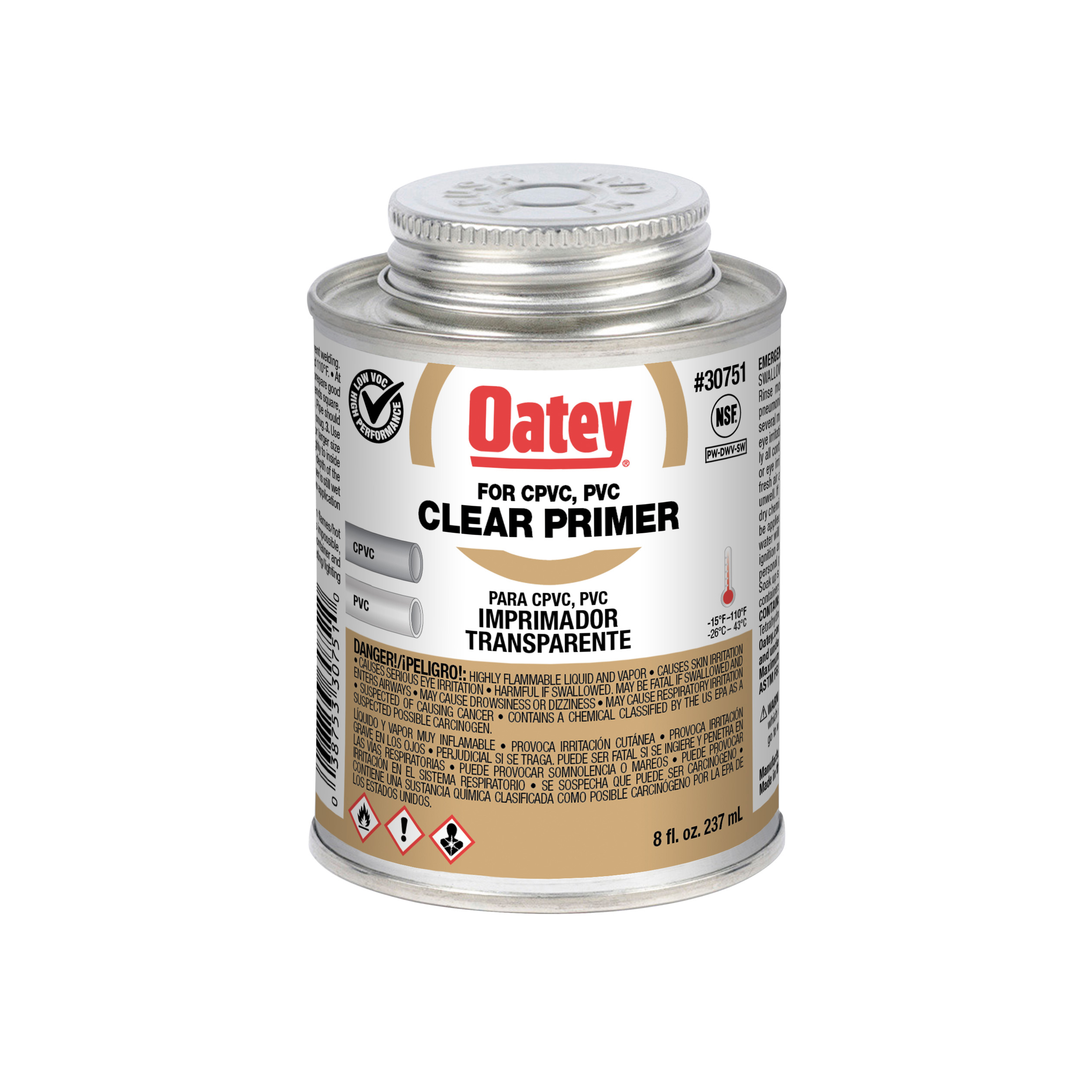 Oatey® Clear Primer verwijdert oppervlaktevuil, vet en vuil en maakt het buisoppervlak zachter voor een snelle, veilige solventlas. Geformuleerd voor gebruik op alle schema’s en klassen van PVC- en CPVC-buizen en fittingen. Oatey producten verdienen al meer dan 100 jaar het vertrouwen van professionele loodgieters.